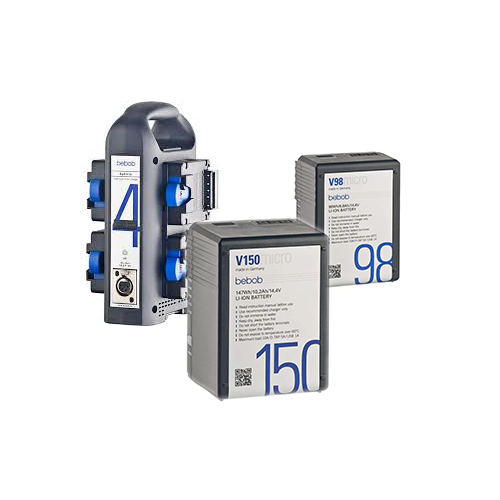 Le chargeur Bebob 4 canaux (VS4) permet de recharger jusqu’à quatre batteries V‑Mount simultanément, avec un courant de charge de 2,5 A par canal (16,8 V), et il intègre une fonction Powerbase sur sa sortie XLR 4 broches (16,5 V / 10 A) pour alimenter des accessoires pendant la charge. Les batteries Bebob V150 Wh V‑Mount offrent une capacité d’environ 143 Wh (9,9 Ah), un poids d’environ 820 g, un courant max de 16 A, avec LED d’état, Twist D-Tap et USB, tandis que les V98 Wh V‑Mount proposent 98 Wh, un bon compromis entre autonomie et poids.